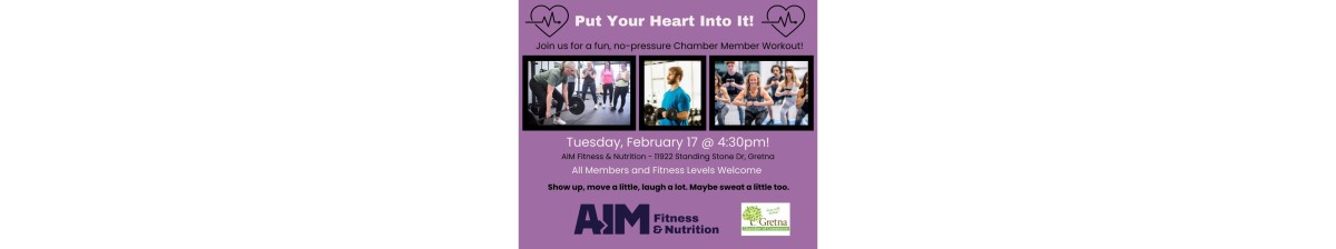 AIM Fitness: Chamber Member Workout Date and Time Tuesday Feb 17, 2026 4:30 PM - 5:30 PM CST Tuesday, February 17 at 4:30pm Location AIM Fitness & Nutrition 11922 Standing Stone Drive, Gretna Fees/Admission Free for Chamber Members - Space is limited Set a Reminder Enter your email address below to receive a reminder message. Email address Select the amount of Days before the event -- Select Days Before Event -- 1 Day 2 Days 3 Days 1 Week Captcha Validation Please complete the Captcha Submit Description Join us for a fun, no-pressure Chamber Member Workout. Set a Reminder Enter your email address below to receive a reminder message. Email address Select the amount of Days before the event -- Select Days Before Event -- 1 Day 2 Days 3 Days 1 Week Captcha Validation Please complete the Captcha Submit Share × Print Email Add to Calendar Facebook Twitter LinkedIn Tell a Friend × Select Calendar Type × Google Yahoo iCal (Outlook, Apple, or other)