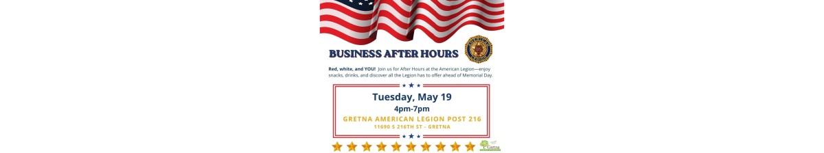 Business After Hours: American Legion/VFW Date and Time Tuesday May 19, 2026 4:00 PM - 7:00 PM CDT Location American Legion - 11690 S. 216th Street, Gretna Set a Reminder Enter your email address below to receive a reminder message. Email address Select the amount of Days before the event -- Select Days Before Event -- 1 Day 2 Days 3 Days 1 Week Captcha Validation Please complete the Captcha Submit Description Red, White and YOU! Join us ahead of the Memorial Day Weekend with a Business After Hours at the American Legion! Drinks, Snacks and Networking. Set a Reminder Enter your email address below to receive a reminder message. Email address Select the amount of Days before the event -- Select Days Before Event -- 1 Day 2 Days 3 Days 1 Week Captcha Validation Please complete the Captcha Submit Share × Print Email Add to Calendar Facebook Twitter LinkedIn Tell a Friend × Select Calendar Type × Google Yahoo iCal (Outlook, Apple, or other)