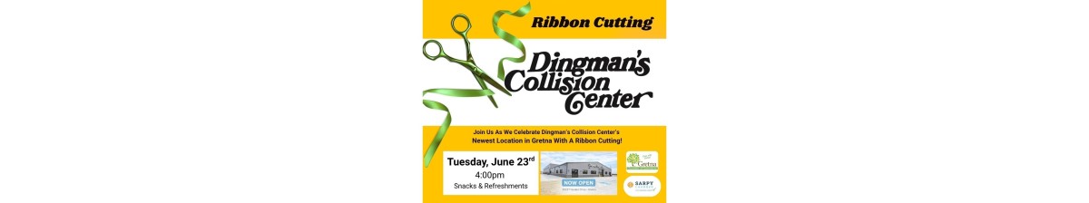 Ribbon Cutting: Dingman's Collision Center Date and Time Tuesday Jun 23, 2026 4:00 PM - 5:00 PM CDT Location 20227 Husker Drive - Gretna Set a Reminder Enter your email address below to receive a reminder message. Email address Select the amount of Days before the event -- Select Days Before Event -- 1 Day 2 Days 3 Days 1 Week Captcha Validation Please complete the Captcha Submit Description Join Us As We Celebrate Dingman’s Collision Center’s Newest Location in Gretna With A Ribbon Cutting! Set a Reminder Enter your email address below to receive a reminder message. Email address Select the amount of Days before the event -- Select Days Before Event -- 1 Day 2 Days 3 Days 1 Week Captcha Validation Please complete the Captcha Submit Share × Print Email Add to Calendar Facebook Twitter LinkedIn Tell a Friend × Select Calendar Type × Google Yahoo iCal (Outlook, Apple, or other)