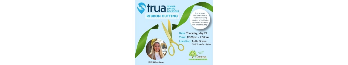 Ribbon Cutting: Trua Senior Living Locators Date and Time Thursday May 21, 2026 12:00 PM - 1:00 PM CDT Location Turtle Doves - 706 W. Angus - Gretna Set a Reminder Enter your email address below to receive a reminder message. Email address Select the amount of Days before the event -- Select Days Before Event -- 1 Day 2 Days 3 Days 1 Week Captcha Validation Please complete the Captcha Submit Description Join us as we welcome Trua Senior Living Locators to the Gretna Business Community with a ribbon cutting and your chance to meet the owner, Kelli. Set a Reminder Enter your email address below to receive a reminder message. Email address Select the amount of Days before the event -- Select Days Before Event -- 1 Day 2 Days 3 Days 1 Week Captcha Validation Please complete the Captcha Submit Share × Print Email Add to Calendar Facebook Twitter LinkedIn Tell a Friend × Select Calendar Type × Google Yahoo iCal (Outlook, Apple, or other)